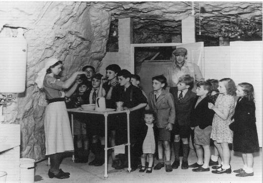 A popular topic with the younger audiences are stories about the children in the Caves during the war. This is a picture taken for the Red Cross in 1940. Children also usually like more details about the episode of Dr Who shot in the Caves in 1972, or the BBC's Merlin from 2009. The Guidedog used to rescue lost visitors in 1910 is a favourite, too!